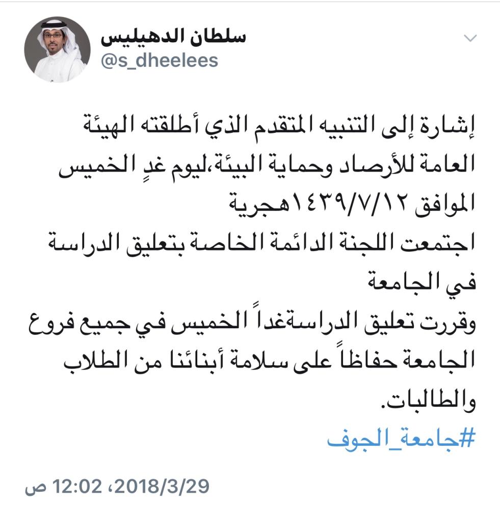 وفي السياق وجه مدير جامعة الإمام بتعليق الدراسة في الجامعة ليوم غد الأربعاء حفاظا على صحة الطلاب والطالبات.