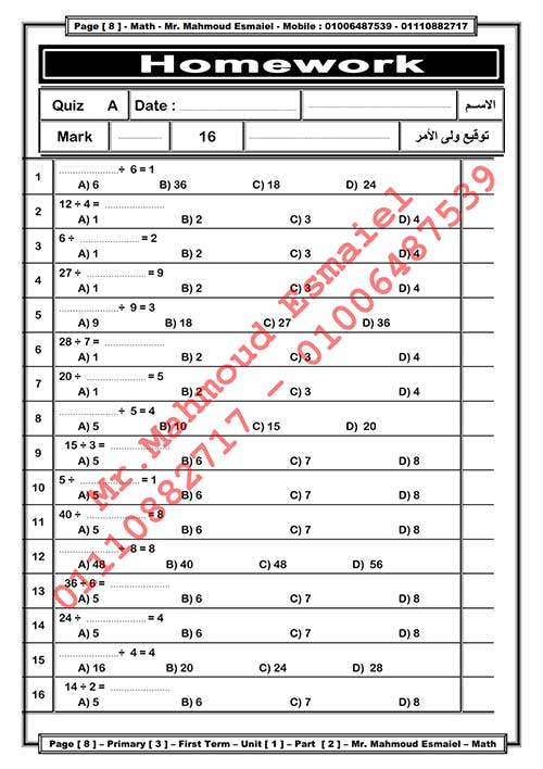 مذكرة جدول الضرب والقسمة من منهج الماث للصف الثالث الابتدائي الترم الأول للاستاذ محمود اسماعيل